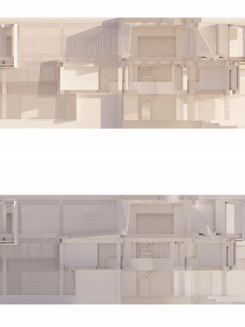 The building is organized along a central axis that intersects the site at three primary nodes of interaction, creating urban thresholds on each edge that invite entry and encourage passage through the library as part of everyday local movement. The architectural envelope blankets this axis, framing three key view corridors and reinforcing the library’s presence within the surrounding urban fabric.